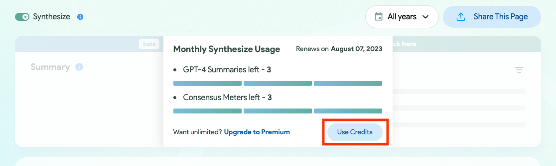 Consensusの大きな特徴である、論文を要約する機能(Summary)と結果を集計する機能(Consensus Meter)を使ってみましょう。検索結果の左上の「Synthesize」スライドスイッチをオンにします。なお、無料プランの場合、これらの機能は月3回まで利用できます。