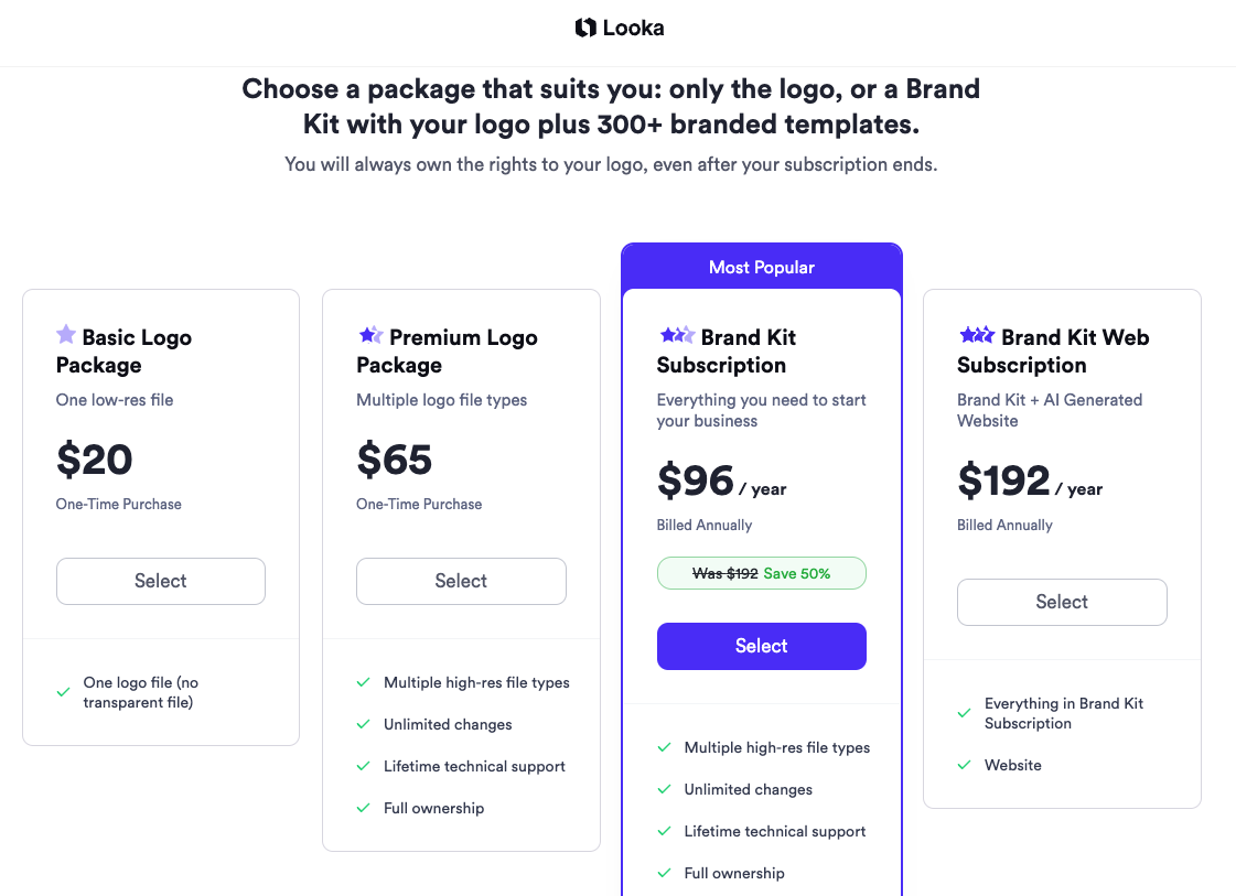 Lookaの料金プランを選択し、支払いが完了すればロゴデータがダウンロードされます。
