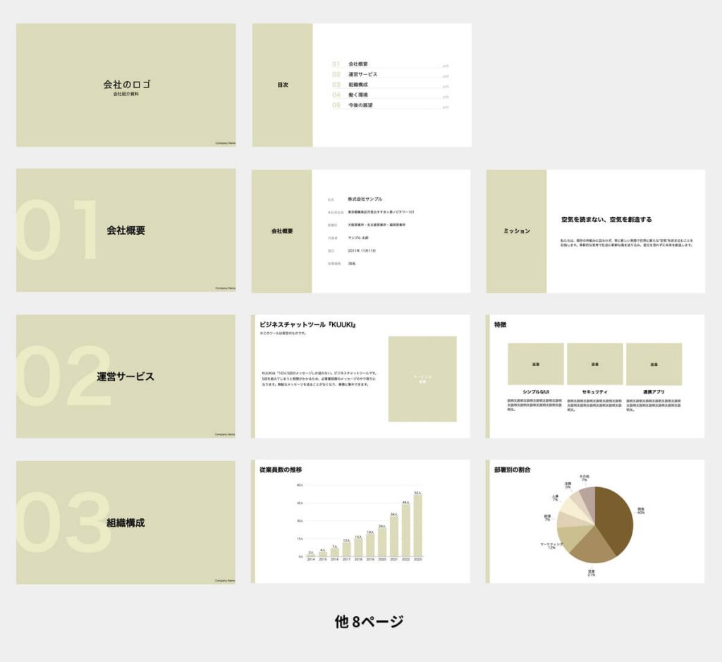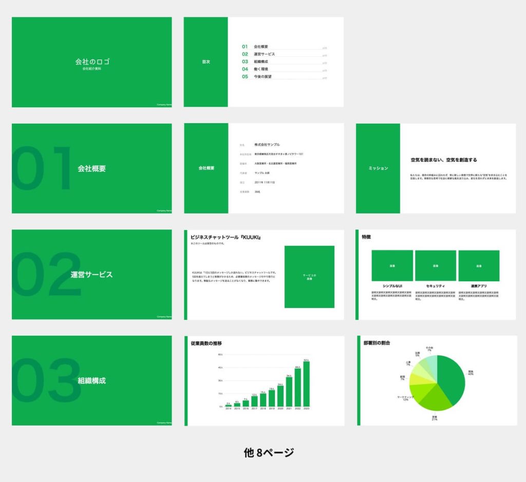 「会社概要」「運営サービス」「組織構成」「働く環境」「今後の展望」の5項目を含んでいます。必要に応じて追加・削除をしてください。